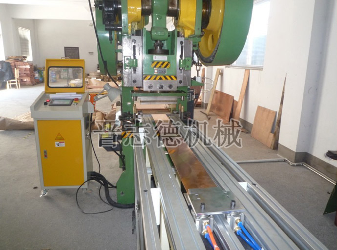 為從根本上解決片材無法自動送料的難題,晉志德機械專門設計研發生產了一款片材送料機,其由上料機構、送料機構、推料機構、電控機構四大功能組件組成,上料機構、送料機構及推料機構的動作均由電控組件控制,通過在立控制電箱的觸摸面板上簡單的設定送料相關參數后,即可將片材準確自動化的送入沖床沖壓位置,實現連續高精度的沖壓生產,不僅節約了沖壓加工時間、提高了生產效率,而且從根本上確保了沖壓加工生產的安全性。