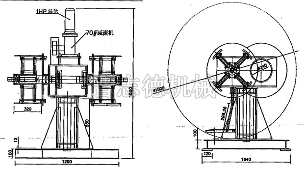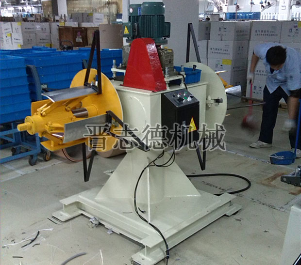 在目前的沖壓生產過程中,多數采用的是重型材料架來放置料卷,重型材料架由基座與安裝在基座上的主軸兩大結構組件組成,其中主軸上另外設置有靠背輪、托塊、漲縮卷筒,卷料通過套在主軸漲縮卷筒上來實現放料與開卷,重型材料架在使用時,當一卷材料用完后,則需將整個生產線停止下來重新裝載卷料,由于材料架承載卷料重量大,因此需很長的裝料時間,大地限制了整個沖壓生產線的有效工作時間;另一方面,重型材料架這種單軸放料方式為保證轉矩的均勻,主軸只能設置于基座的中央,這樣雖不會出現轉軸松動、傾斜的現象,但會導致裝料的十分不便。
