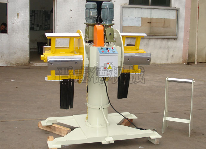 晉志德雙頭材料架由底座、機(jī)架、轉(zhuǎn)軸、馬達(dá)、電箱組成,其中轉(zhuǎn)軸上均勻安裝有兩個(gè)收料主軸,兩個(gè)收料主軸以轉(zhuǎn)盤(pán)為中心對(duì)稱(chēng)設(shè)置且中軸線相重合;收料主軸上配有呈弧形的支撐塊,支撐塊頂部呈圓弧形以配合料卷的內(nèi)圓料管,支撐桿與支撐塊組合后中間開(kāi)設(shè)有卡槽,卡槽將支撐塊分割為對(duì)稱(chēng)的兩半組成漲縮筒,雙漲縮筒的結(jié)構(gòu),確保了雙頭材料架實(shí)現(xiàn)了無(wú)停機(jī)快速下料生產(chǎn)之目的。