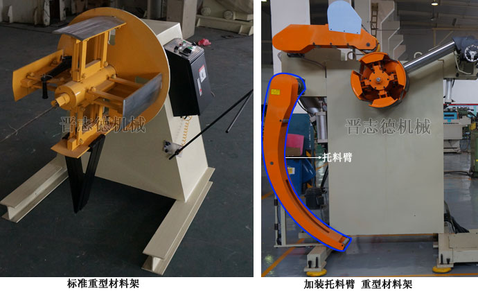 重型材料架作為使用廣,定制化程度高的放料、開卷設備,其有很多選配裝置可供沖壓業主所選擇,如常見的加裝變頻器用于調速、加裝壓料臂避免散料、加裝油壓擴張便于開卷、加裝上料臺車便于上料、加裝光電感應裝置避免材料表面損傷等等,不過晉志德重型材料架除了常見選配裝置之外的還有一種沖壓業主知曉的不多,卻作用很大的選配裝置,其能使卷料開卷更加穩定、順暢,同時可輔助完成后續整平機臺自動化的入料動作,它那就是托料臂。